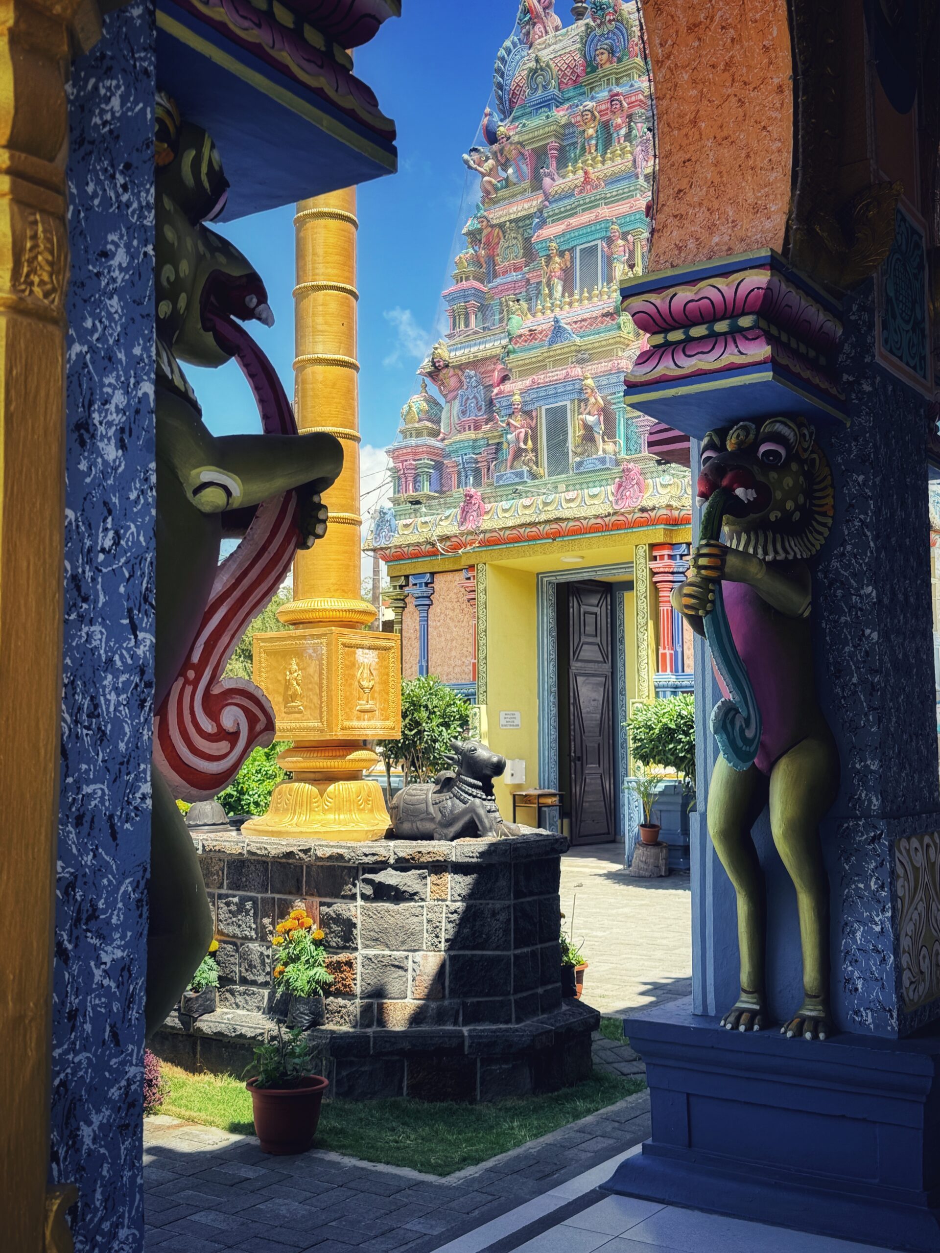 Am Nachmittag zieht es mich ins Inselinnere, in die grüne Bergwelt rund um den markanten Pieter Both, dessen steinerner Kopf wie ein Wächter über die Landschaft ragt. Die Straße windet sich durch Dörfer und Teehänge, vorbei an üppigen Frangipani-Bäumen und farbenfrohen Hindu-Tempeln. Hier spürt man das Herz von Mauritius – ruhig schlagend, doch voller Leben.